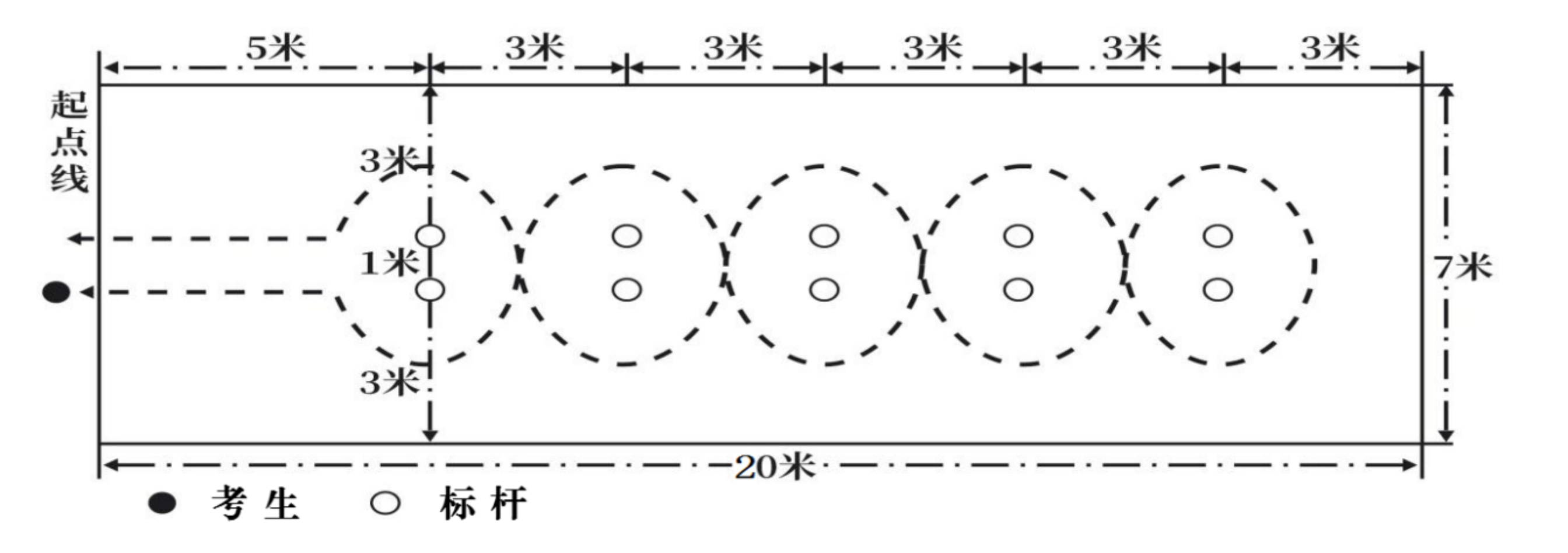 1.考生足球运球时,出现出发时抢跑、漏绕标志杆、碰倒标志杆、故意手球、人或球出测试区域等行为,该次成绩无效。